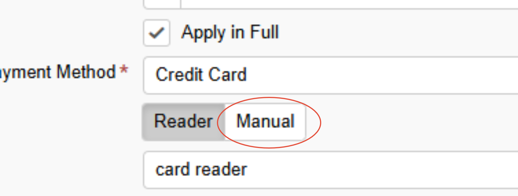 On Revolution process the invoice as normal except after selecting Credit Card, select the Manual option that is located next to Reader Option.