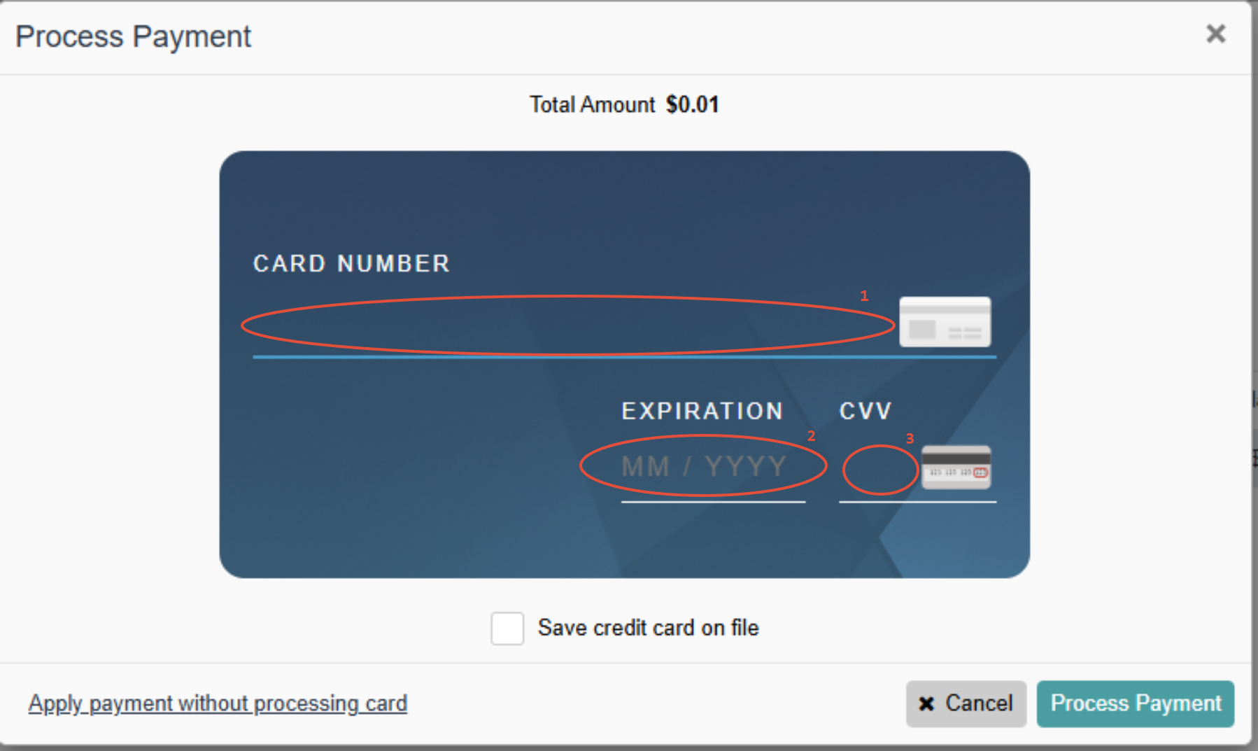 From there, press process payment & receipt on the bottom right of the window and a credit card will prompt on screen. Enter the credit cards 1) Card Number 2) Expiration Date 3) CVV ; then press Process Payment